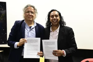 El martes 15 de agosto, Izrael Moreno, rector de la Facultad de Cine y Germán Pérez, director del canal ZOOM TV de Colombia realizaron una